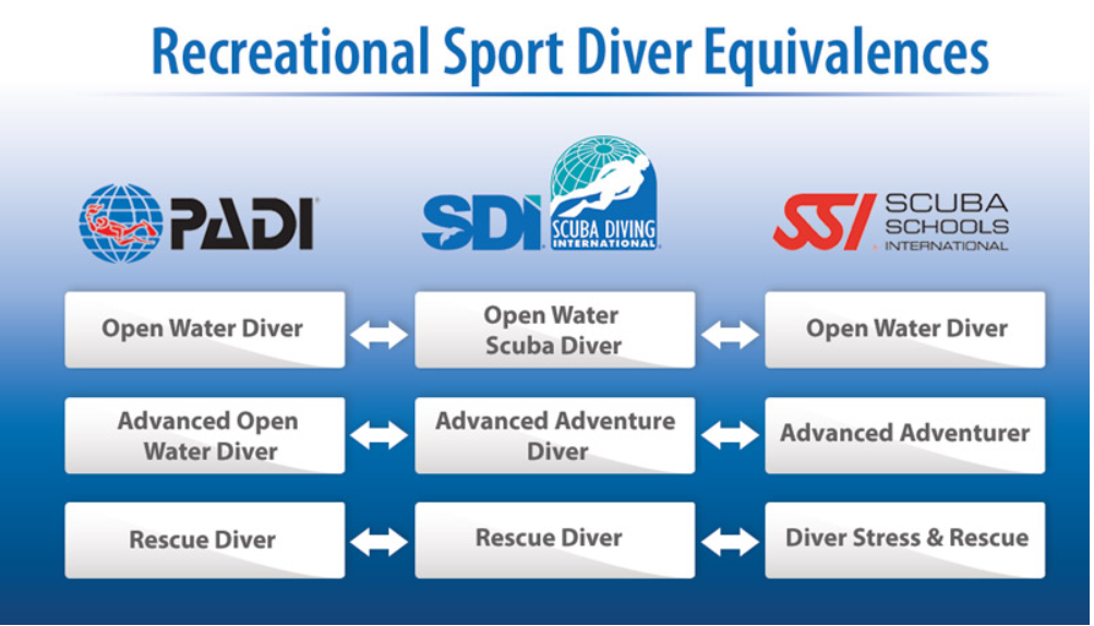 Nitrox Diver, Advanced Search and Recovery, Wreck Diver, Current Water Diver, Night/Limited Visibility Diver, Dry suit, Deep Diver, Computer Diving, Rescue Diver.